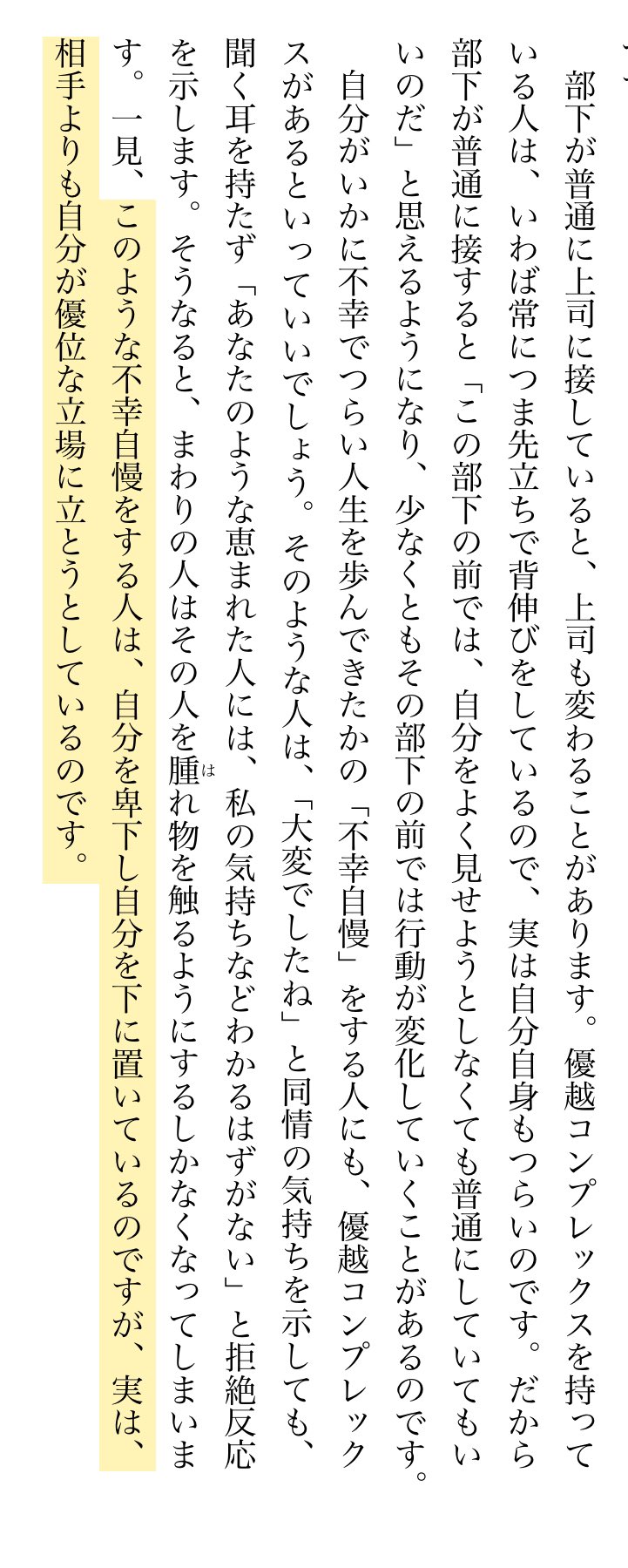 こよみゆうか このような不幸自慢をする人は 自分を卑下し自分を下に置いているのですが 実は 相手よりも自分が優位な立場に立とうとしているのです ぉ 不幸自慢 も 優越コンプレックス なのですね あぁ 私は不幸だから マウントです